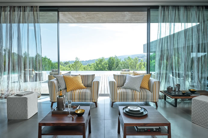 Vor allem für sonnendurchflutete Räume bieten sich die Outdoorstoffe mit ihren überzeugenden Pflegeeigenschaften an. Sonnenstrahlen lassen konventionelle Stoffe verblassen und nach kurzer Zeit porös werden. Durch Farbpigmente, die in der Faser eingelagert sind, wird eine extrem hohe Lichtechtheit erzeugt, und das Verblassen ist auch bei intensiver UV-Einstrahlung fast ausgeschlossen. Im Weiteren sind Outdoorstoffe wetterresistent und bilden somit auch keinen Schimmel. Die große Auswahl der Stoffe lässt keine Wünsche offen. Ob tolle Designs oder interessanten Unis, alle Stoffe eignen sich bestens und sehen toll aus. Es ist einfach überwältigend, wie schön Sie die Dessins und Unis miteinander kombinieren können.
